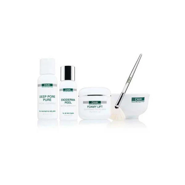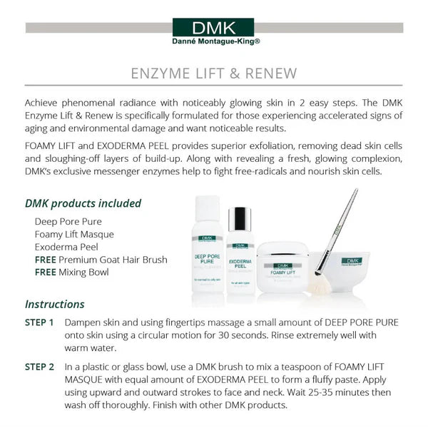 Achieve phenomenal radiance with noticeably glowing skin in 2 easy steps. The DMK Enzyme Lift & Renew is specifically formulated for those experiencing accelerated signs of aging and environmental damage and want noticeable results. FOAMY LIFT and EXODERMA PEEL provides superior exfoliation, removing dead skin cells and sloughing-off layers of build-up. Along with revealing a fresh, glowing complexion, DMK’s exclusive messenger enzymes help to fight free-radicals and nourish skin cells.